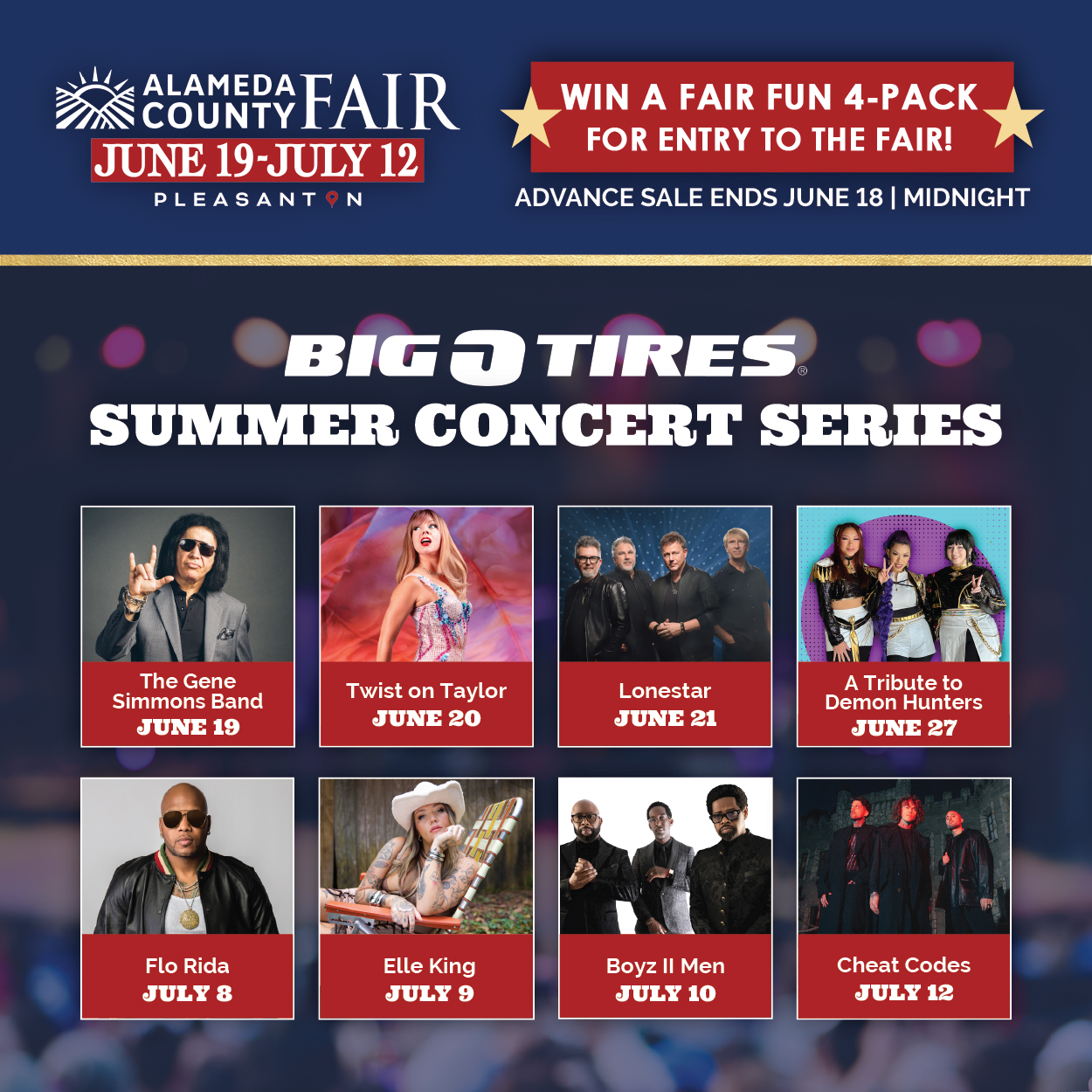 Alameda County Fair in Pleasanton – Big O Tire Concert Series… kick off the party June 19th and rock out with the Gene Simmons Band, then see Flo Rida, The Beach Boys, Hoobastank, Tower of Power, Elle King, Lonestar, Boyz to Men and more. Like K-Pop? How about a tribute to Demon Hunters? Close out the concert series with DJ Trio Cheat Codes on July 12th. The best summer nights are at the fair. Buy online and skip the line at www.AlamedaCountyFair.com.